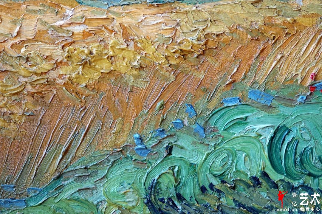 在《奥维尔绿色的麦田》中,梵高摒弃了先前的乡村小屋、风车等题材,来描绘飘动的云朵以及高耸的麦草。一大片蓝色与绿色的波浪中,点缀着星星点点的小黄花,整幅画面洋溢着清新宜人的感觉。