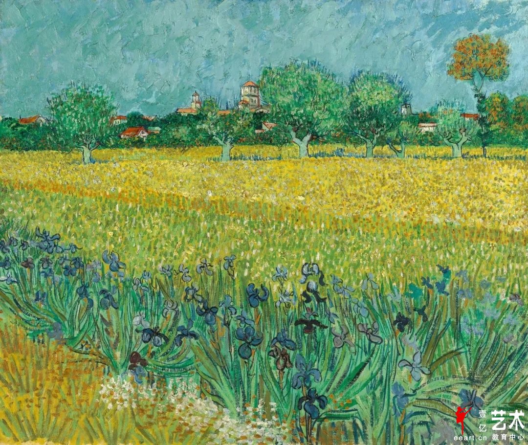 而在法国阿尔勒,梵高笔下的麦田与鸢尾花形成了鲜明对比。他还受到日本版画的影响,用一个尖锐的对角线,来放大前景中的鸢尾花细节。
