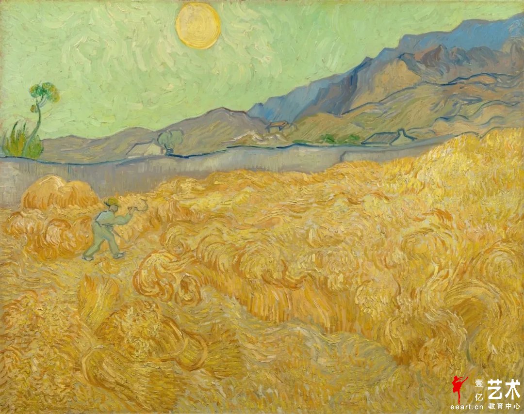 而到了秋天收获的时节,梵高总会捕捉最纯粹的风景。太阳像个硕大的咸蛋,天空有点发绿,山丘却是蓝色的。大片麦田里,金色的麦浪随风翻滚,有一个人挥舞着镰刀在辛勤收割。这幅画很能代表梵高的画法,笔触简单,直线、点和圆就构成了丰富的画面。