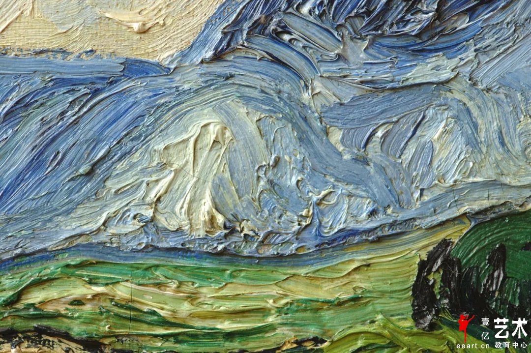 云朵一块块卷曲着,紧贴着山峦起伏的线条。右侧一株丝柏,像一座高塔般的指向天空。前景的麦浪一波波翻飞,仿佛可以看到风在麦田中行走的形状。