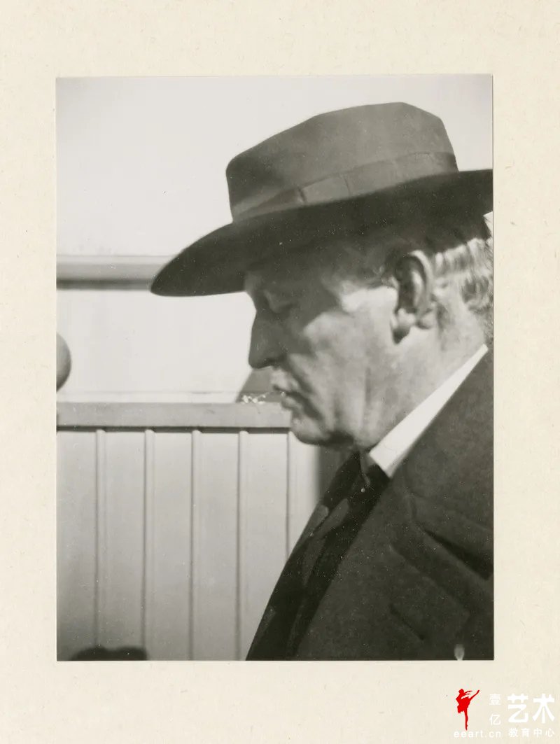 爱德华·蒙克:戴帽子的侧脸自拍,1930年,于埃克利冬季工作室的台阶上。Photo © Munchmuseet